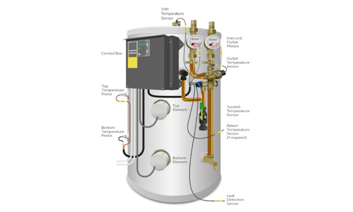 The brain of the tank is the control box. This is pre-wired to the elements; water meters; probes; sensors; and optional leak detection equipment.