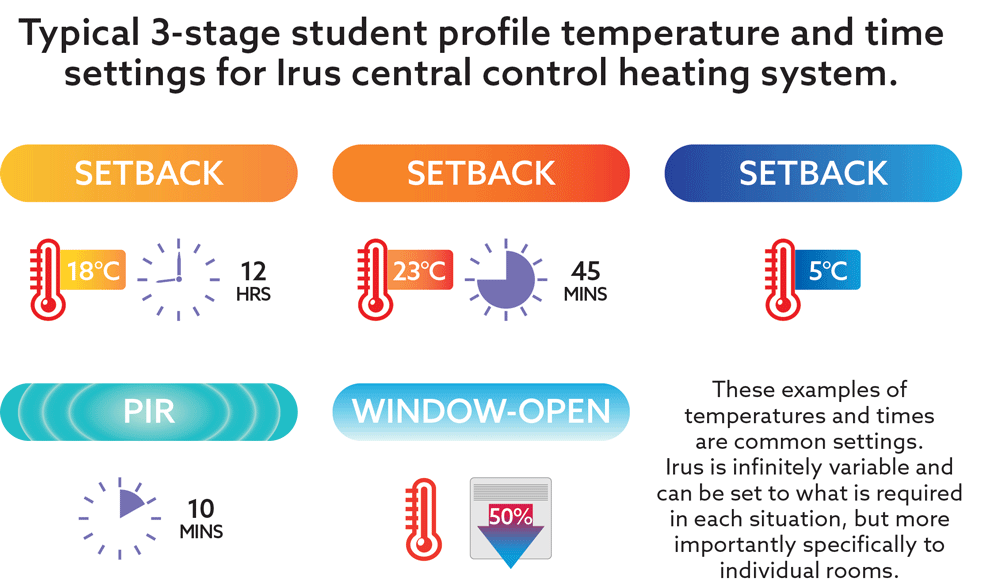 Being a centrally controlled internet system, universal adjustments can be made from anywhere – as Melissa explains, “We are really keen on a reset button for the end of the year so that when students return to site in September all rooms will be back to the standard profile and we won’t have various different settings throughout blocks.” She continues, “The main drivers for considering Irus were energy, carbon, and of course cost reduction.”