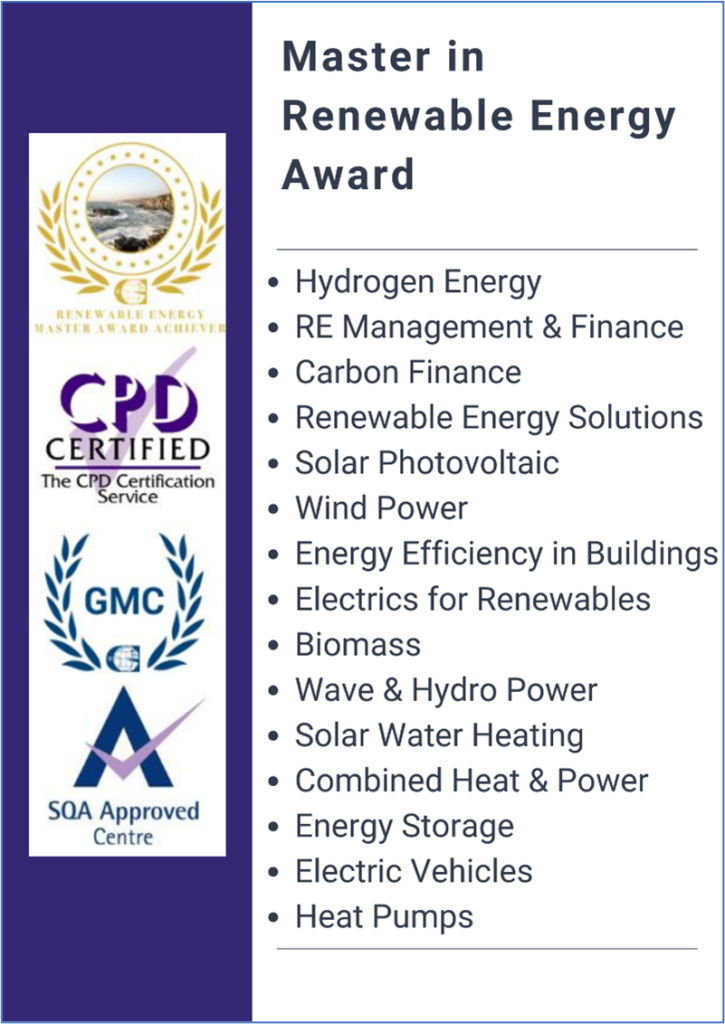 Receive access to the REI’s catalogue of 15 accredited courses and become a Master in Renewable Energy when a minimum of 12 courses from the list below are completed within an 18-month period. You will gain 280+ CPD (Continuous Professional Development) hours during this programme.