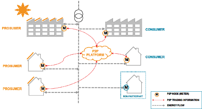 - Peer to Peer trading involves transactions between prosumers, that is consumers who also produce electricity for example from their excess rooftop solar generation, and consumers who have a demand for electricity to power their homes.