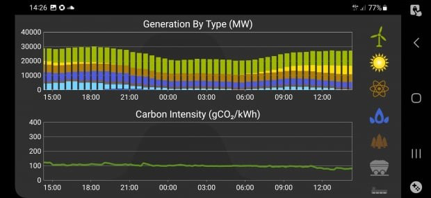 Even on the UK’s windiest and sunniest day, when all renewables and the nuclear fleet are at full throttle, they make up only 80% of our generation stack. Even though the average carbon content drops to 80 gCO2/kWhr, we continue to burn gas in our centralised Combined Cycle Gas Turbines (CCGTs), which make up around 15% of the generation stack.