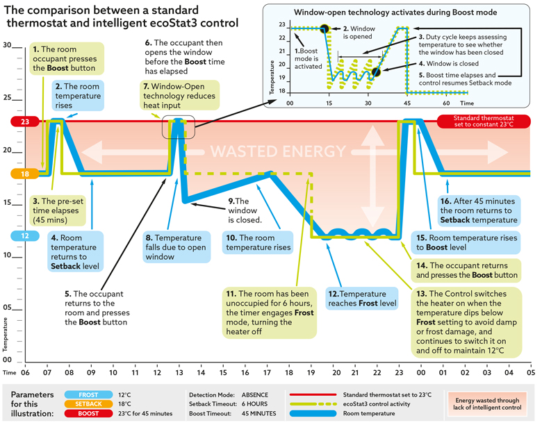 The principal behind ecoStat3’s energy saving is the 3-mode profile – Setback-Boost-Frost modes. This ensures occupants enjoy a comfortable environment (Setback), while giving them the capability to increase temperature (Boost), but for a pre-set time. When rooms are unoccupied or ambient temperature is equivalent to setback, heaters boilers, or wet radiators are switched off, becoming active again only if there is the possibility of material damage from damp or frost (Frost).