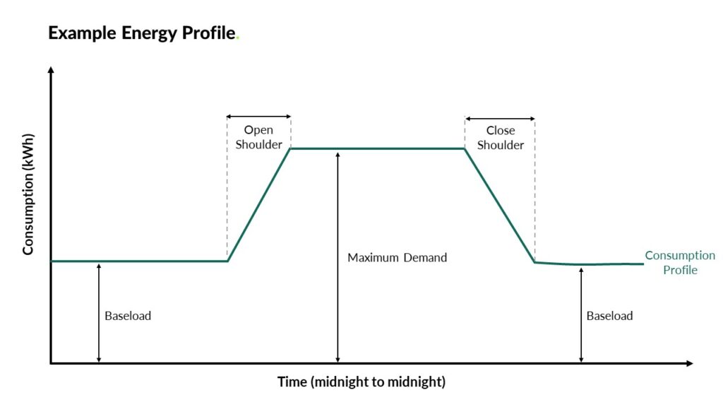 When profiling energy we often look at periods of consumption within a day to identify energy waste. Terms such as baseload, maximum demand and shoulders are used to segment the consumption for comparison.