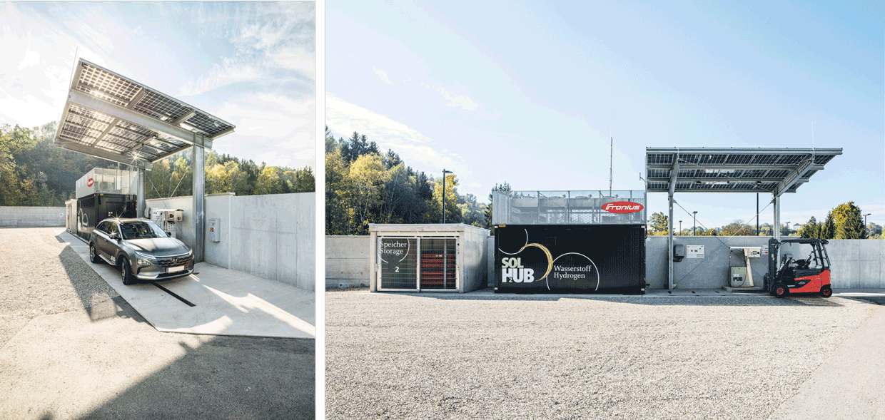 Hydrogen will above all play a central role in the decarbonisation of transport – its benefits are most clearly seen where large ranges, heavy loads and short refuelling times are among the considerations. The zero-emission, low-noise and powerful hydrogen drive has great potential when replacing conventional combustion engines in diverse vehicle types, such as buses, HGVs, special vehicles and forklift trucks. Fronius has already developed a solution that is scalable depending on the customer’s requirements: the Fronius Solhub. The facility at Steinhaus will have its very own Solhub, including reconversion and storage systems, and hydrogen vehicles are now being added to the existing vehicle fleet.