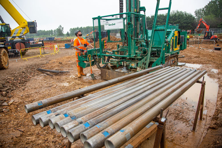 Drilling for an ambient temperature shared ground loop array utilizing boreholes drilled to depths of between 145 – 190m has recently been completed on site, which will provide a source of sustainable heat energy for the ground source heat pumps installed inside each property. This innovative heat pump system architecture, pioneered by Kensa, avoids heat losses through distribution pipework which increases system efficiency. It also allows each homeowner to have independent control over their own heating and hot water, and the freedom to switch energy supplier.