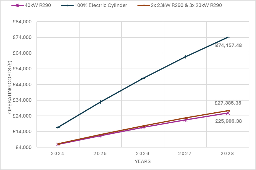 After full consultations with the site and the contractor, the system chosen was the 40kW R290 air source heat pump system. Despite the two other possible systems offering quicker recovery periods the client opted for one single heat pump unit. An additional factor governing the decision was the fact that the 40kW R290 system, incorporating 2 x1000 L cylinders, emitted less carbon and was more economical to run in the long term